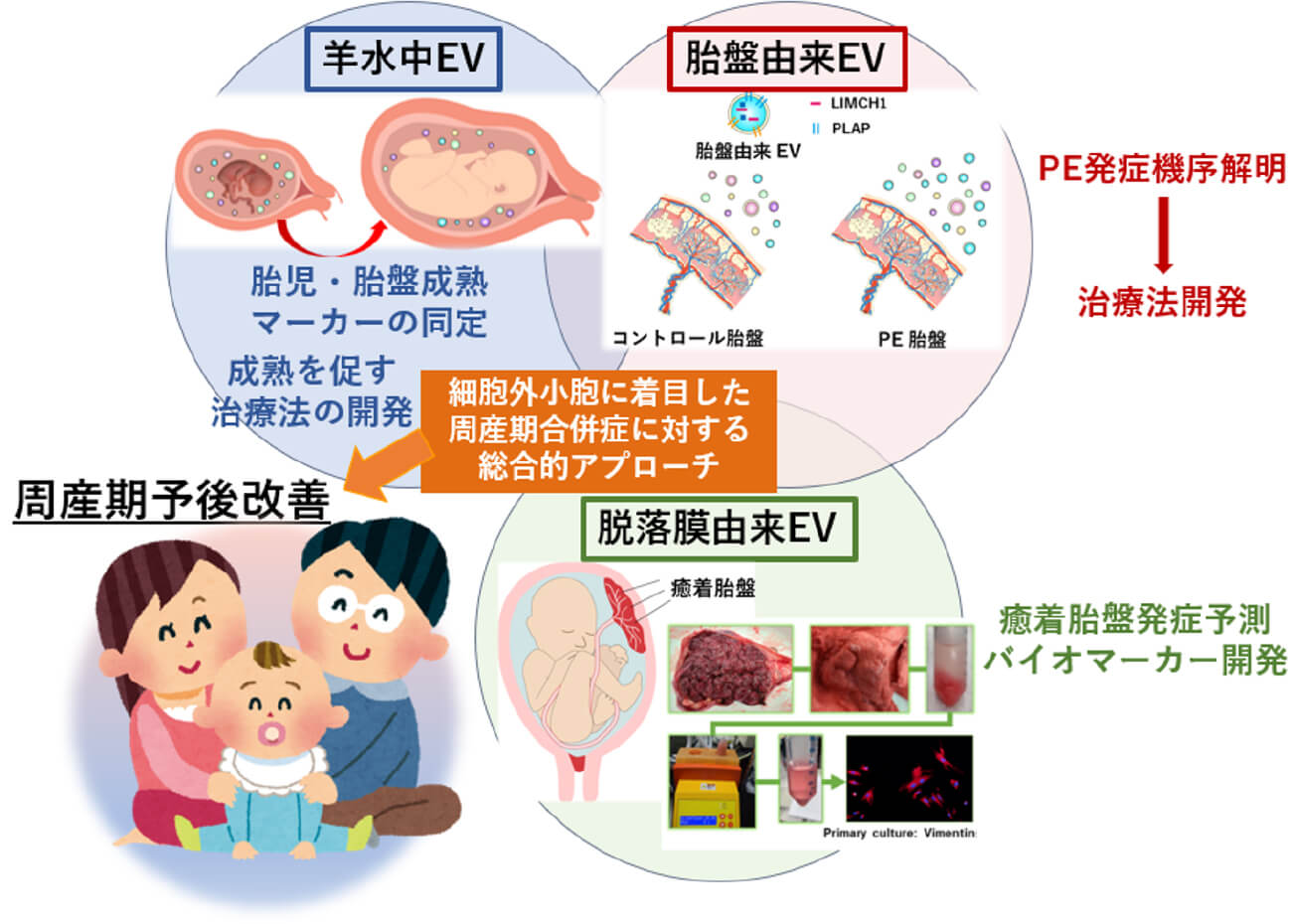 あらゆる生細胞が放出する細胞外小胞は、内部にタンパク質、核酸、脂質等を含み細胞間の情報伝達を担っていることが報告されています。今までに、先天性横隔膜ヘルニアという出生後に呼吸障害で亡くなる可能性がある重症な疾患の予後を羊水中細胞外小胞を用いて高精度に予測できることを報告しました(Matsuo et al. J Extracell Biol. 2024)。現在は妊娠高血圧腎症に関する研究もはじめています。