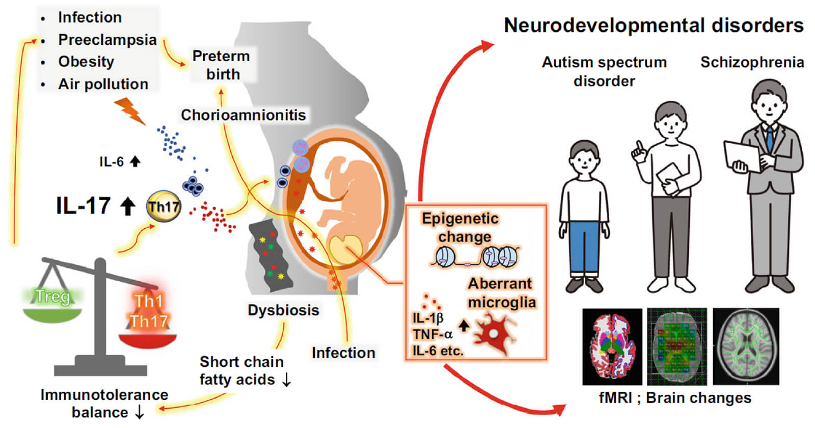 妊娠中の高血圧や、炎症、投薬、栄養などは、胎児の臓器や脳の発達に長期的な影響を及ぼしている可能性があります。本研究室では同意の得られた妊婦から臨床検体(母体血、臍帯血、羊水、胎盤、臍帯)を採取・保管し、解析に用いています。また、小児科との共同研究で新生児の頭部MRIを解析し、妊娠高血圧症候群、絨毛膜羊膜炎、ステロイドが新生児期の脳に影響を及ぼしている可能性を明らかにしました(Ushida et al. Pregnancy Hypertens. 2021, Katsuki et al. Early Hum Dev. 2021, Nosaka et al. Arch Gynecol Obstet. 2024, Fuma et al. Eur J Obstet Gynecol Reprod Biol. 2024)。動物実験では妊娠高血圧モデルマウス、母体炎症モデルマウス等を用いて、母獣の環境が仔の脳に与える影響を研究しています(Imai et al. Free Radic Biol Med. 2016, Fuma et al. Commun Biol. 2025)。